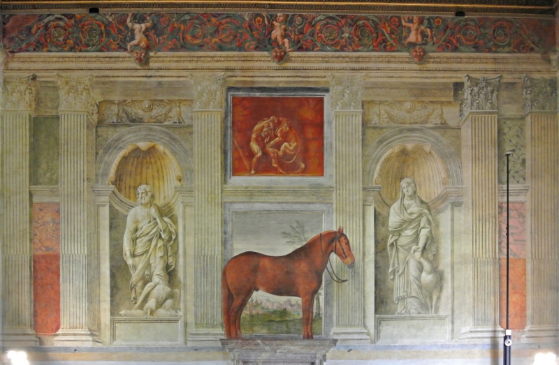 Si tratta dell’ambiente più sontuoso del Palazzo, destinato ad accogliere solamente gli ospiti più illustri per #banchetti e cene. La camera prende il nome dalla storia di Amore e Psiche, dipinta sulla volta e nelle lunette e i ventidue passi illustrati da Giulio Romano a Palazzo Te sono tratti dalle Metamorfosi di Apuleio, scrittore latino del II secolo d.C. Le pareti sud e ovest coinvolgono il visitatore nei preparativi di un sontuoso banchetto al quale partecipano gli dei: protagonisti dell’evento Amore e Psiche, sdraiati sul klìne e tra loro la figlia, Voluttà. Si tratterebbe del banchetto che si svolge sull’isola di Venere, così come descritto nel testo umanistico dell’ Hypnerotomachia Poliphili, idealmente paragonata all’isola del Te. La porzione della scena sulla parete meridionale (che continua per un breve tratto anche sulla parete orientale) mostra, tra i vari personaggi, da sinistra Vulcano, Apollo, Dioniso e Sileno a sinistra della credenza, Amore e Psiche appunto e altre figure secondarie, satiri e una schiera di animali, molti dei quali esotici (una coppia di tigri, un cammello, un elefante, una giraffa, un babbuino e un leone). Al centro della parete dedicata al banchetto di Amore e Psiche, sono esibite bellissime suppellettili che adornano la tavola imbandita per celebrare le nozze di Amore con la bellissima Psiche. Così scrive Vasari nelle Vite descrivendo la credenza: