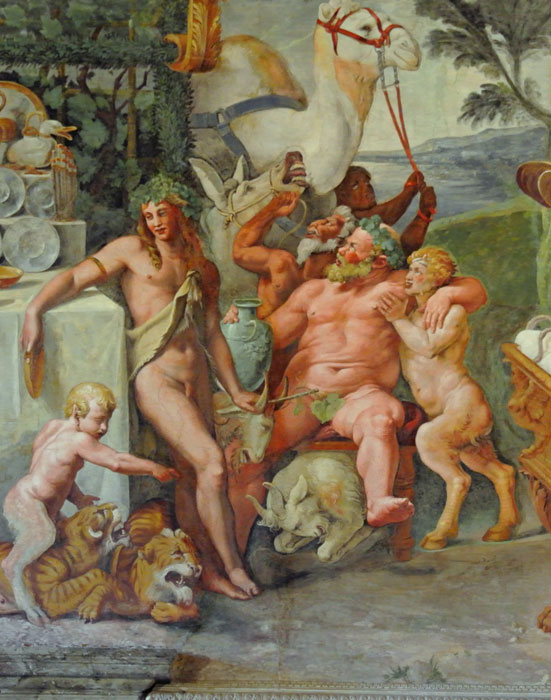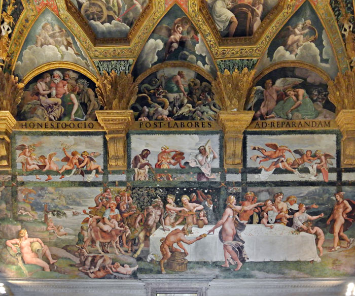 La qual credenza, che è a mezzo tondo in botte, è ricoperta di festoni di verzure e fiori e tutta piena di viti cariche di grappoli d’uve e di pampani, sotto i quali sono tre ordini di vazi bizzarri, bacini, boccali, tazze, coppe et altri così fatti, con diverse forme e modi fantastichi e tanto lustranti, che paiono di vero argento e d’oro, essendo contrafatti con un semplice colore di giallo e d’altro così bene, che mostrano l’ingegno, la virtù e l’arte di Giulio, il quale in questa parte mostrò esser vario, ricco e copioso d’invenzione e d’artifizio.