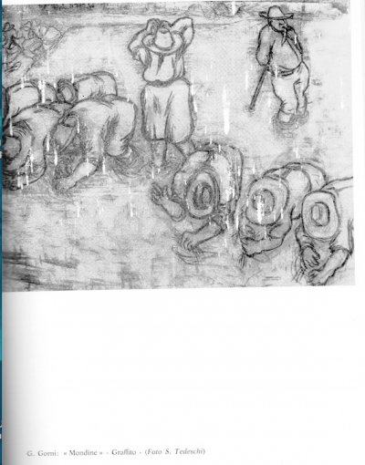 AUTORE: Giuseppe Gorni CRONOLOGIA: 1970 ca TIPOLOGIA: Graffito TITOLO: [Mondina a lavoro] COLLOCAZIONE: Collezione privata DESCRIZIONE: Mondine a lavoro nella risaia sorvegliate dal padrone