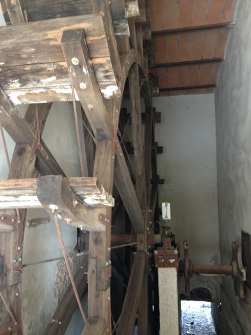 MATERIALE: Legno e ferro DESCRIZIONE: Le cinghie e gli ingranaggi di legno trasmettono i movimenti alla ruota USOFunzione: Produzione di energia per il movimento delle macchineOccasione: Lavorazione del riso